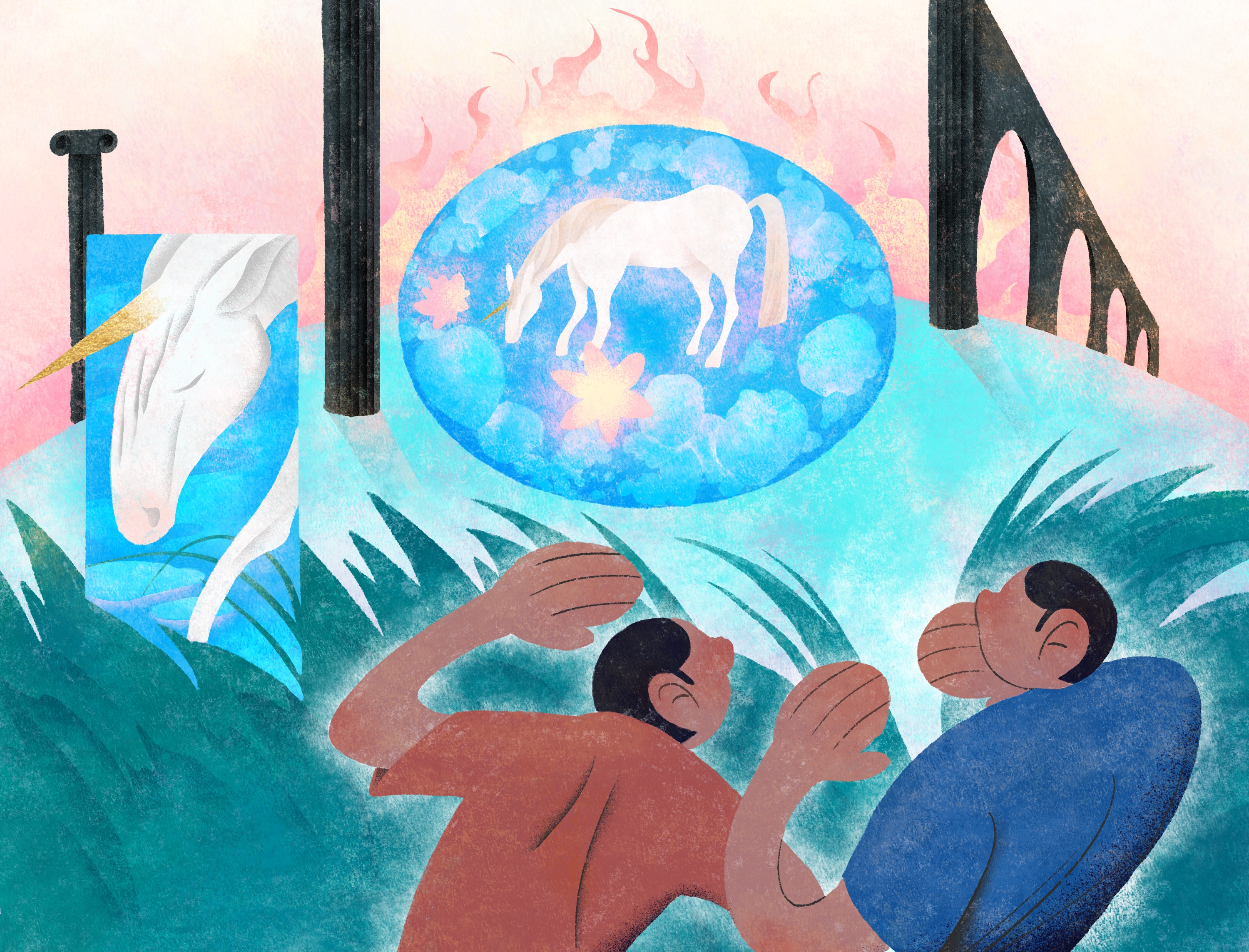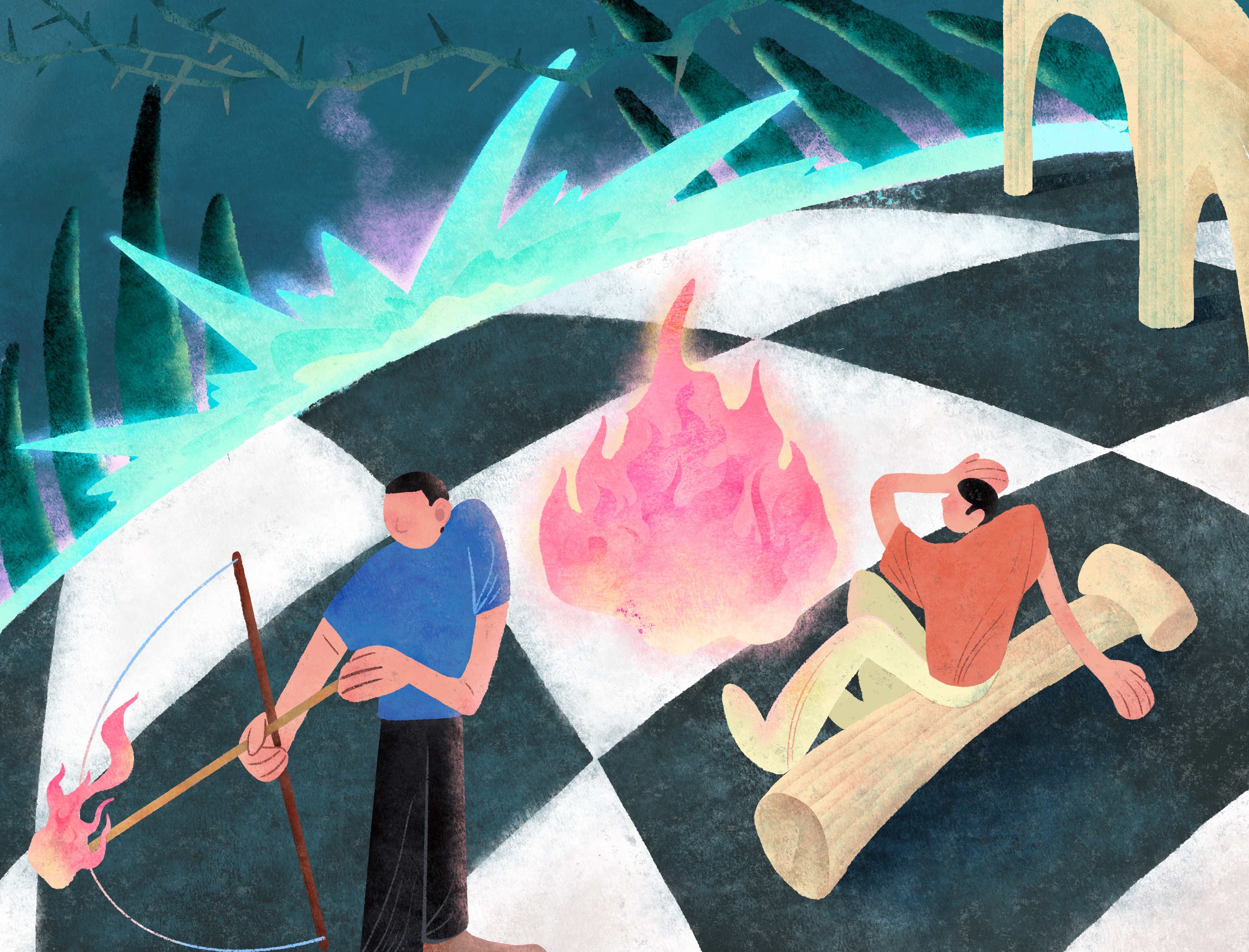 This series of illustrations is inspired by my deep sense of time, and the idiom of “White Horse Crosses the Gap” - time rushes by like a white horse. When I was a child, I felt that time was slow and long, and that each moment seemed to stretch infinitely; however, after I turned 20, time accelerated, and seemed to pass by unnoticed. I visualized my hostility towards time as two villains who embarked on a tense journey in the painting: tracing the footsteps of time, perceiving its invisible existence, hunting its inscrutable nature, declaring war on its relentless passage, and finally lamenting the unstoppable nature of time in the midst of an exhausting struggle. I have come to accept that time will not be harmed, nor will it cease to be a whisper of eternity.